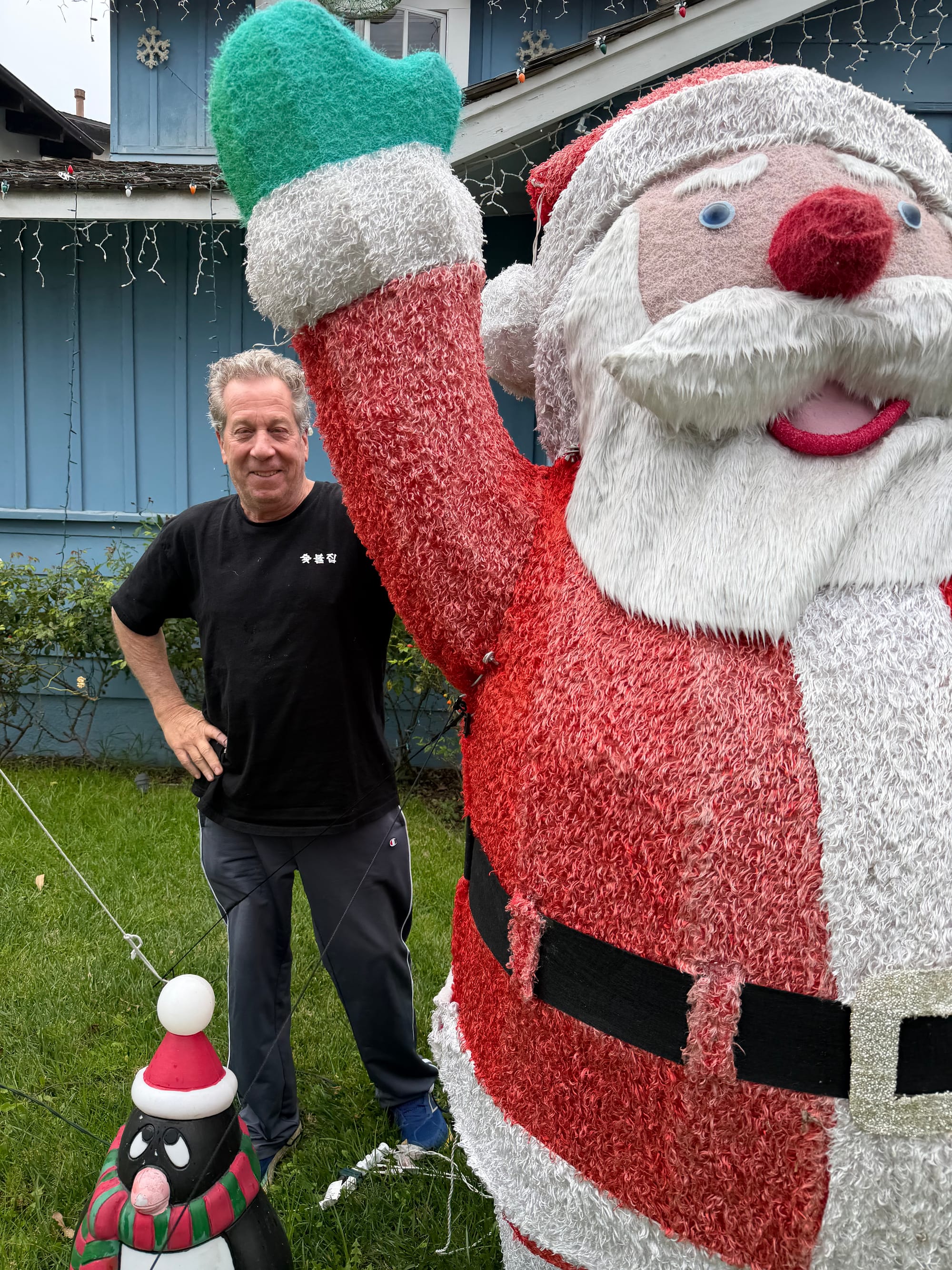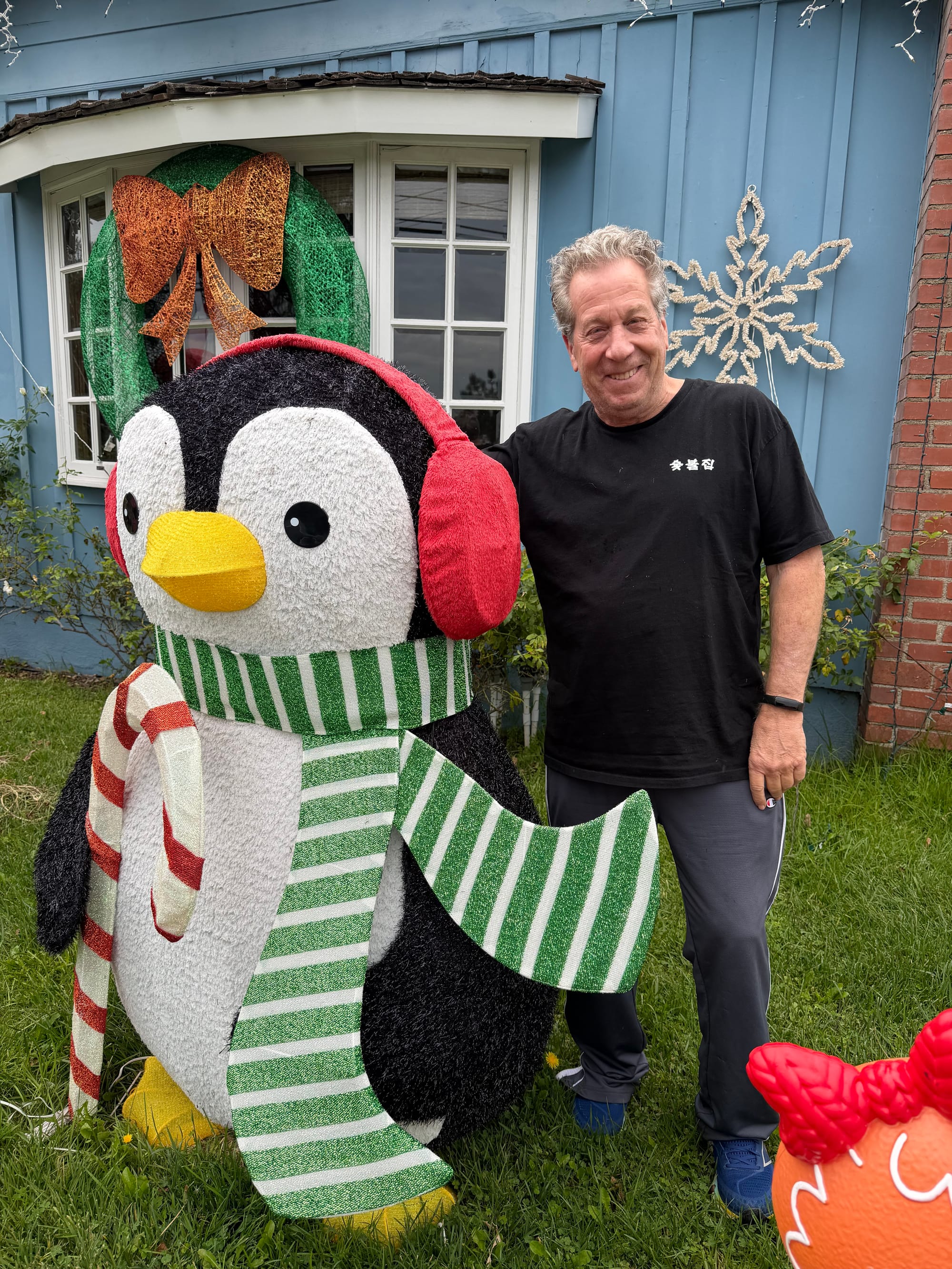 Most of the decorations come from Costco, a magnificent giant Santa, penguins, snowmen, towering gift boxes with oversized bows. But Freitag also searches online every year for something new and unique. This year, it was giant gingerbread people, positioned near his Hanukkah bear, his playful nod to his Jewish roots.